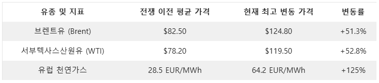 경제적 관점에서 본 이란전쟁 현황의 가장 큰 위협은 호르무즈 해협의 폐쇄입니다. 이란 혁명수비대는 작전 직후 세계 원유 물동량의 약 20%가 통과하는 호르무즈 해협을 물리적으로 차단한다고 발표했습니다. 이로 인해 국제 유가는 단숨에 배럴당 120달러를 돌파하며 에너지 시장에 극심한 혼란을 야기했습니다. 브렌트유와 WTI 가격은 하루 만에 15% 이상 급등했으며, 천연가스 가격 또한 폭등세를 보이고 있습니다.